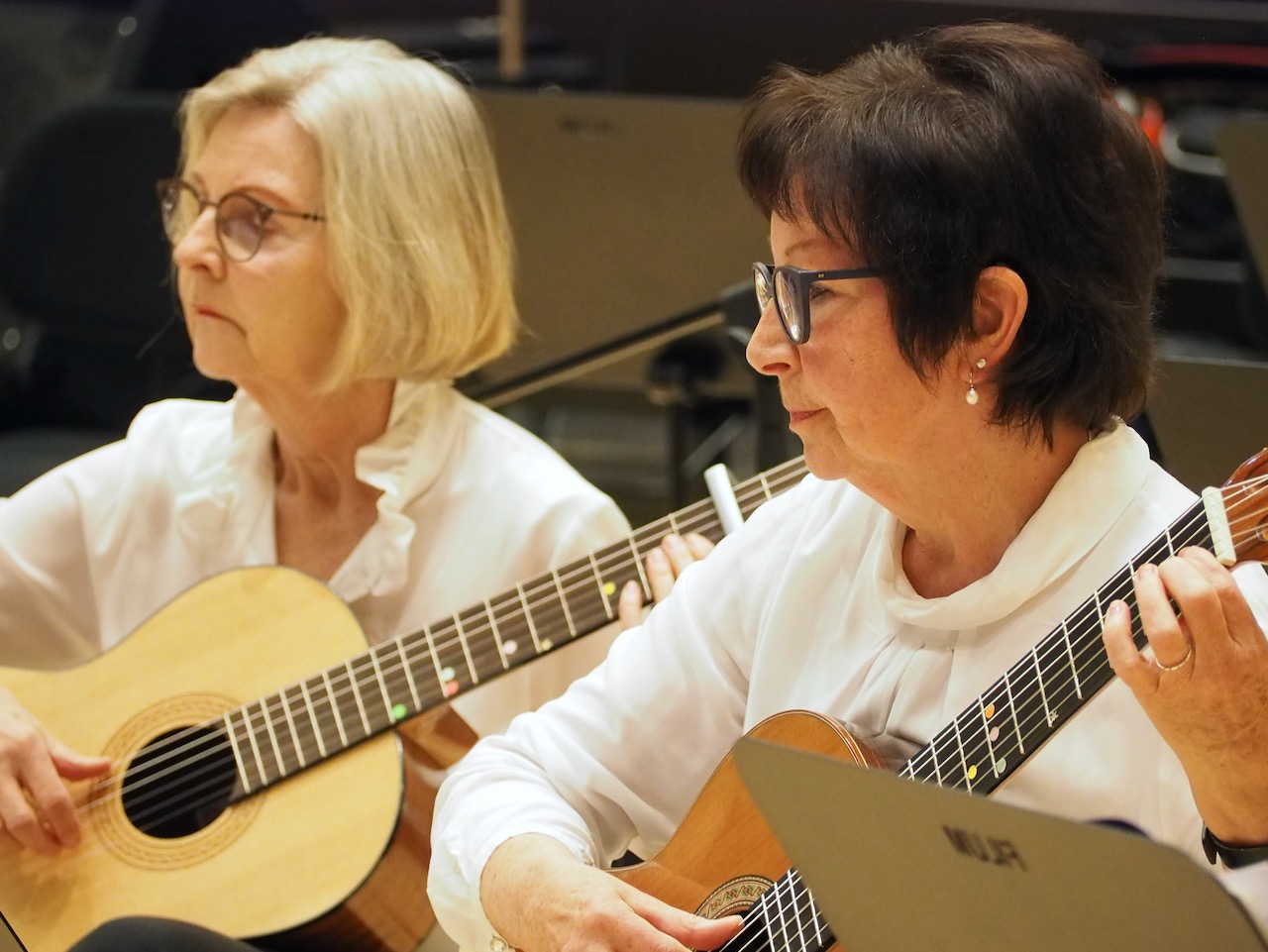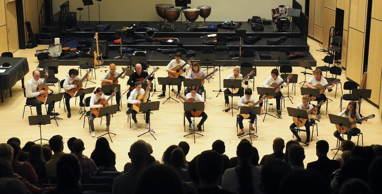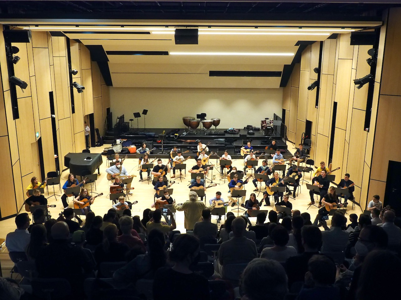 In kleinen und großen Ensembles spielten am Sonntag, 27. März 2022 unter der Leitung von Thomas Wagner und Katrin Kramer fast 50 Spieler*innen mit ihren Gitarren im FILUM Konzertsaal.