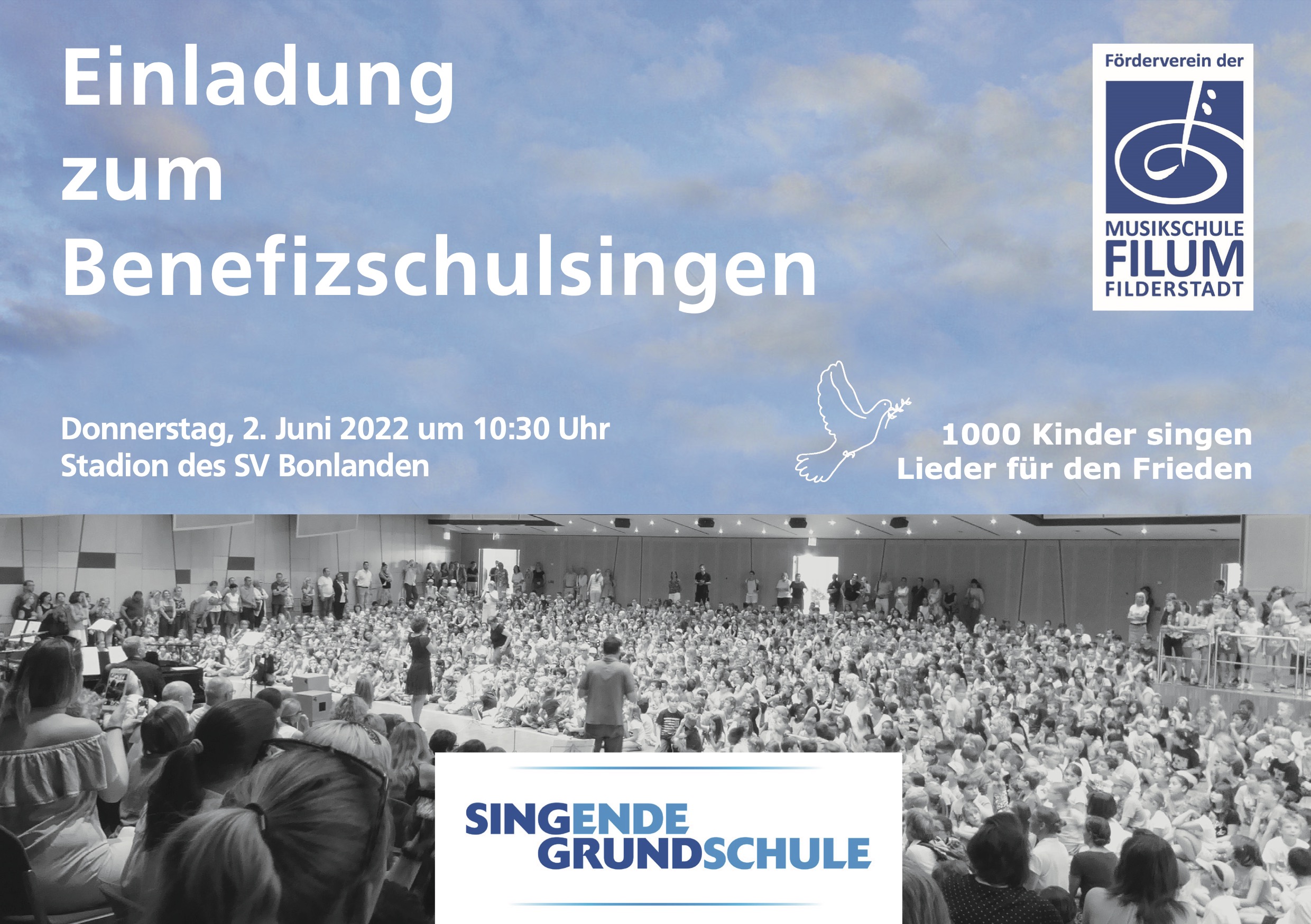 Unter der Leitung von Monika Grauschopf und unterstützt von Mitgliedern des SV Bonlanden werden die 1000 Kinder mit Begleitung einer Band von der Tribüne aus ihr Bestes geben, um das Publikum auf dem Rasenplatz mit dem Klang ihrer Stimmen einmal mehr zu verzaubern. Die Kinder haben die Lieder mit viel Herzblut einstudiert, denn ihnen ist bewusst, wofür sie singen. Die Musikschule Filderstadt und alle Projektpartner und -förderer freuen sich auf ein großes Publikum und zahlreiche Spenden.