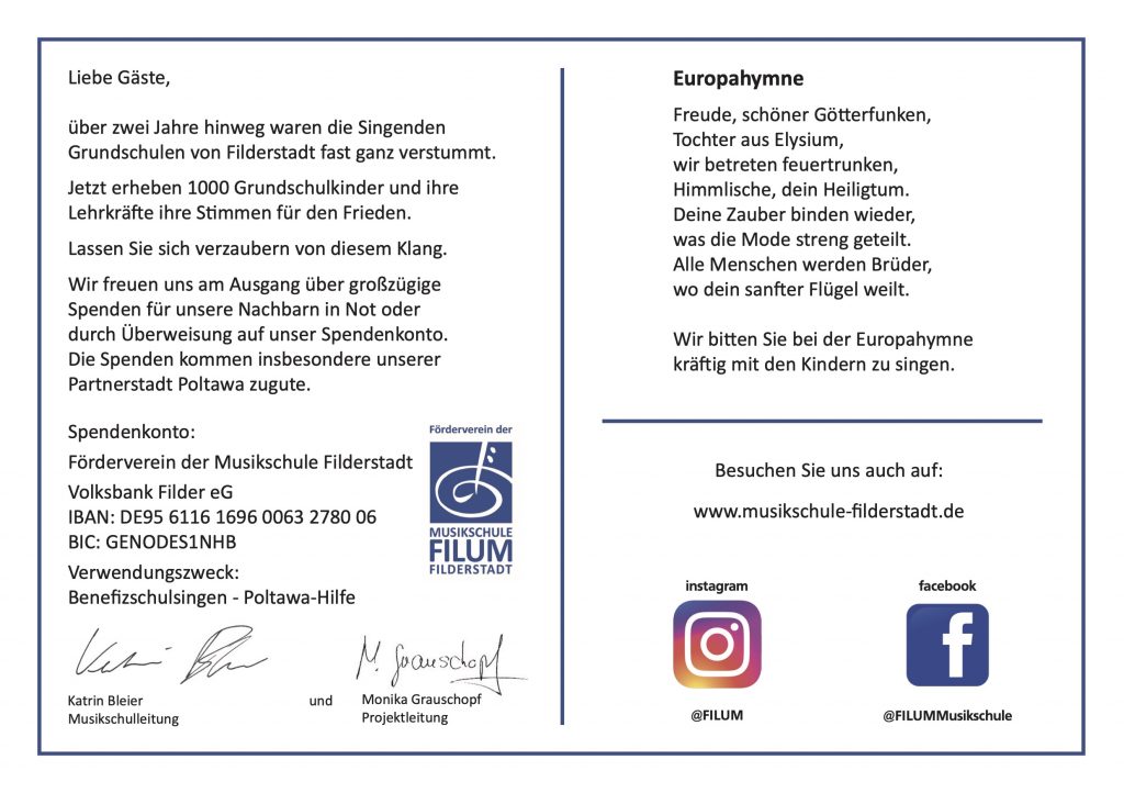 Die eingenommenen Spenden werden den Opfern des Krieges in der Ukraine und ganz besonders Filderstadts Partnerstadt Poltawa in der Ukraine zu Gute kommen. Dazu werden Geldspenden nach dem Benefizschulsingen am Ausgang gesammelt oder können alternativ auf das Spendenkonto des Fördervereins der Musikschule Filderstadt überwiesen werden.