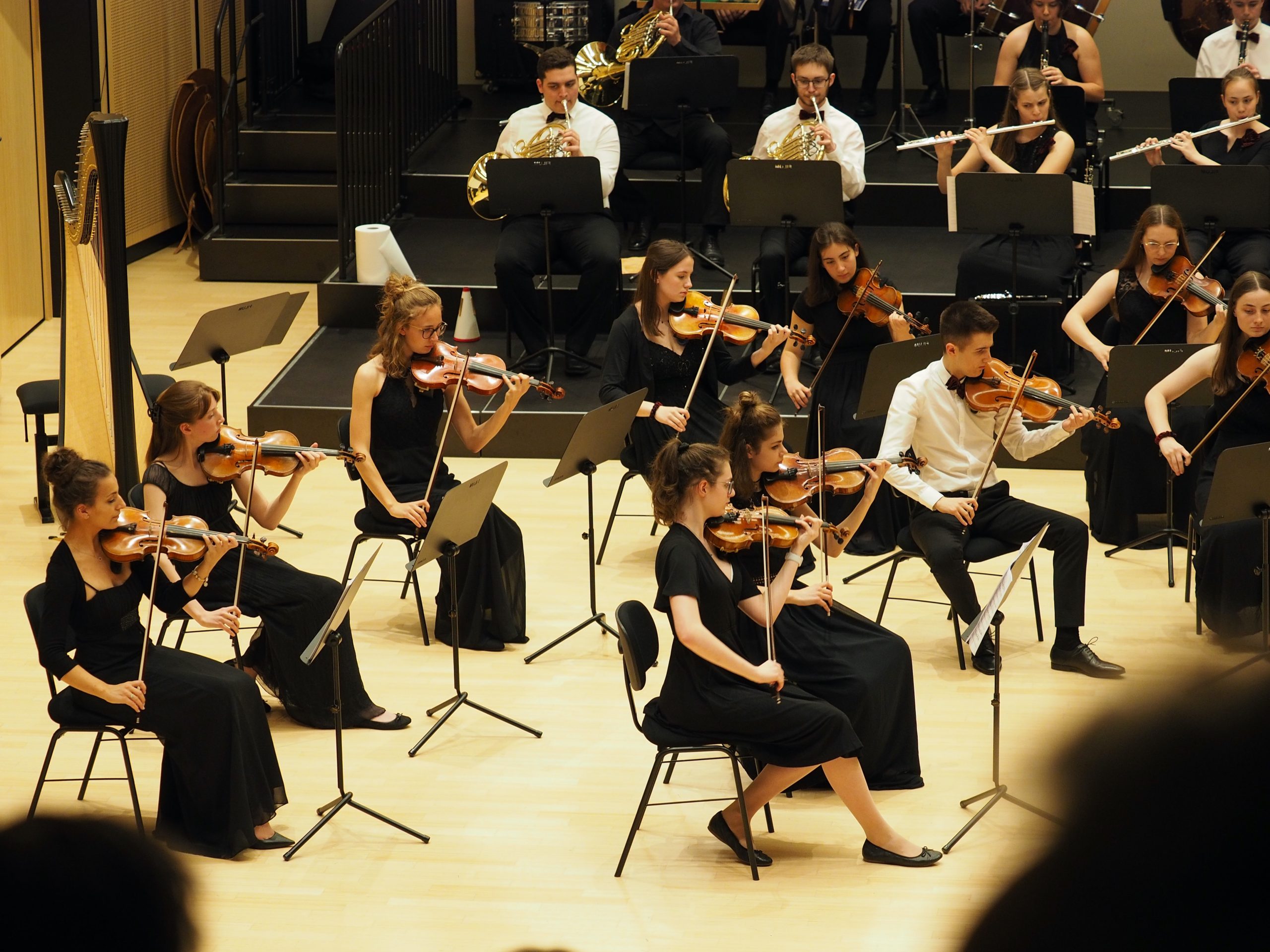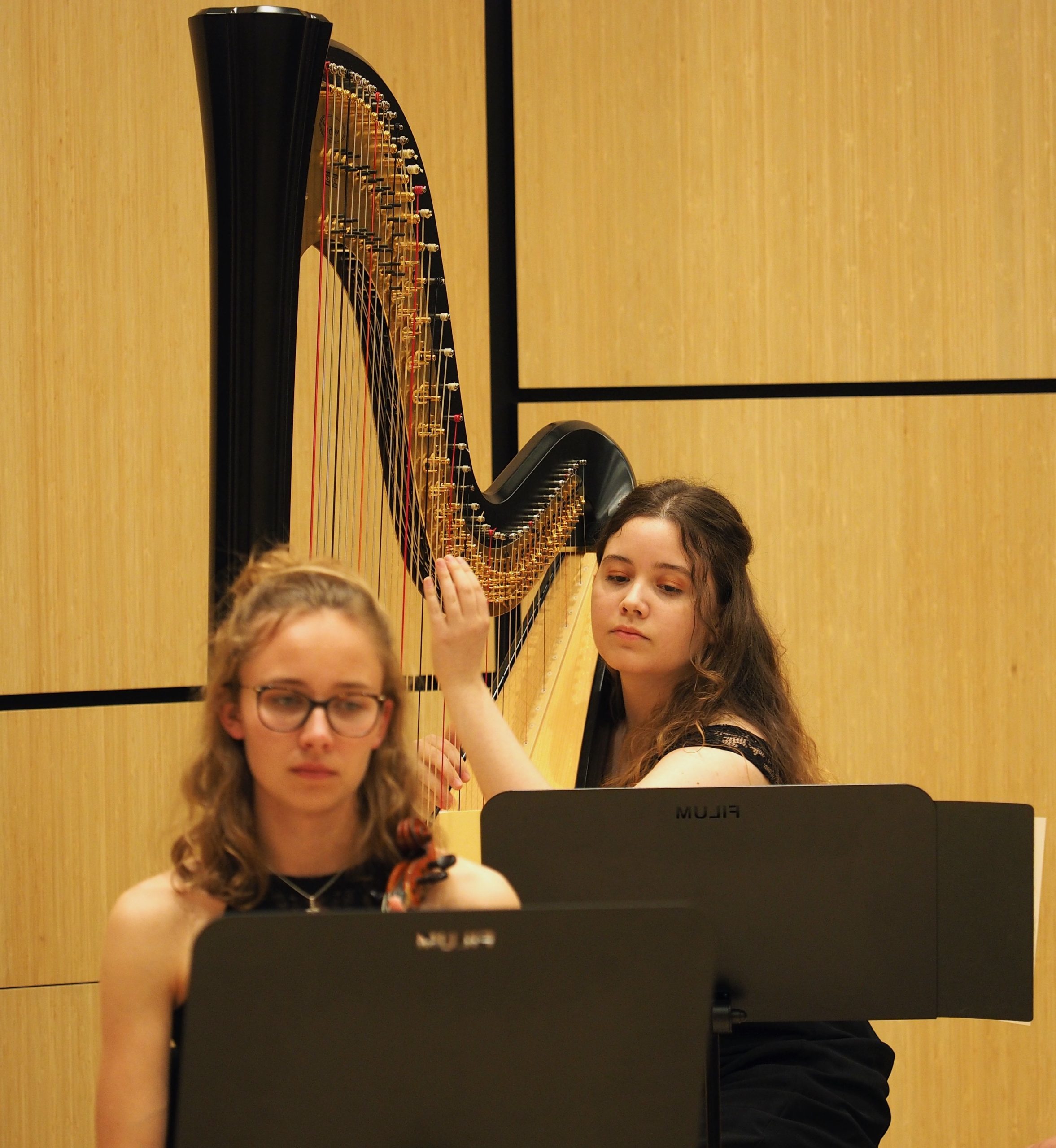 Ein Höhepunkt des Abends war das kurzfristig ins Programm aufgenommene Konzert für Harfe, das die Zuhörer*innen im fast bis auf den letzten Platz besetzten Konzertsaal mit ganz besonderer Klangfarbe in den Bann zog. Zukünftig wird das Unterrichtsangebot an der Musikschule um dieses Instrument erweitert werden. Musikschulleiterin Katrin Bleier sowie Musikdirektor Robert Wieland durften sich im Anschluss des Konzertes über großzügige Spenden für die Anschaffung einer Harfe für die Musikschule freuen.