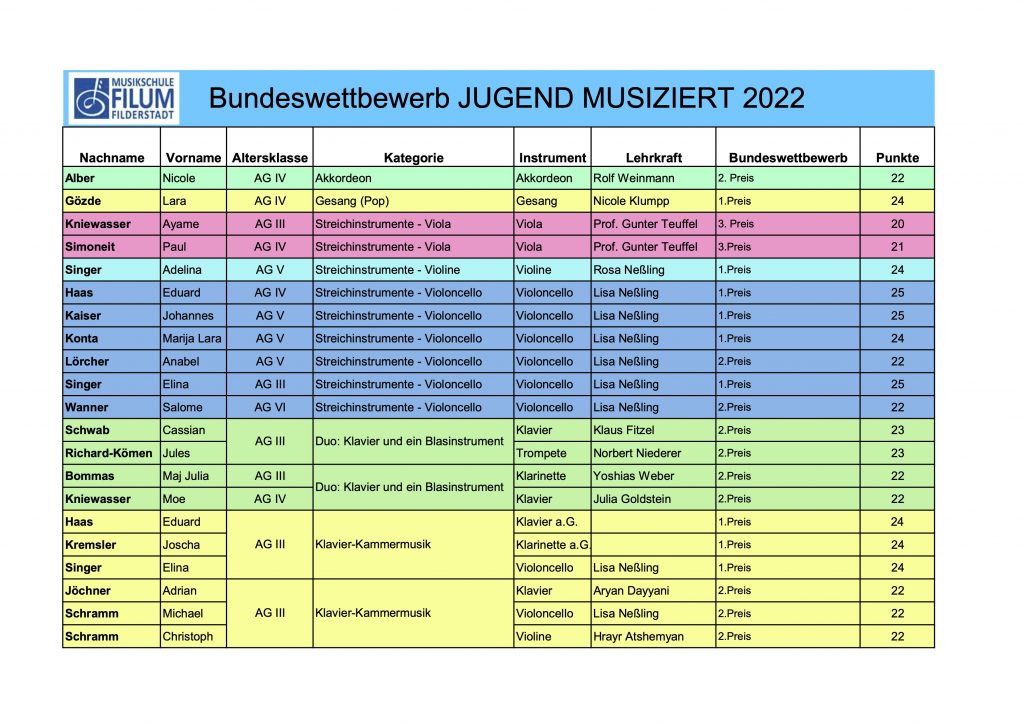 Insgesamt 21 Preise haben Schüler*innen der Musikschule Filderstadt beim Bundeswettbewerb „Jugend musiziert“ in Oldenburg erhalten. 9-mal 1. Preis, 10-mal 2. Preis und 2-mal 3. Preis. Die Musikschule mit Musikschulleiterin Katrin Bleier gratuliert allen Preisträger*innen und ihren Lehrkräften ganz herzlich.