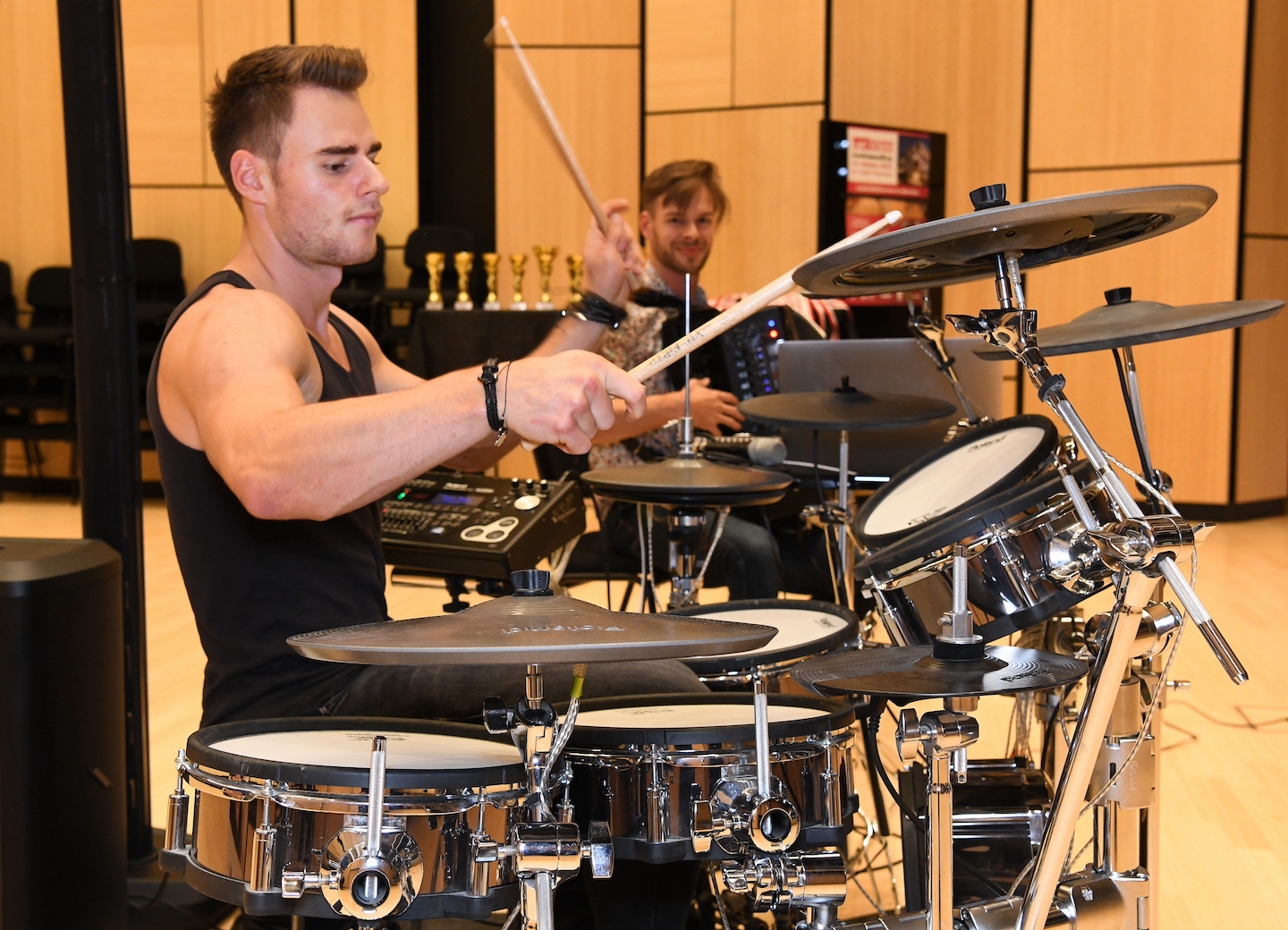 Ein Highlight des Abends war im Anschluß der zweiten Preisverleihung das Duo Fabian & Matthias Matzke. Eigenkompositionen und spezielle Bearbeitungen in rockigem Stil für Schlagzeug und Digitalakkordeon beeindruckten das Publikum.