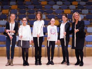 Je nach körperlicher Entwicklung wird zunächst auf kleineren und leichteren Querflöten bzw. auf Instrumenten mit gebogenem Kopfstück gespielt.